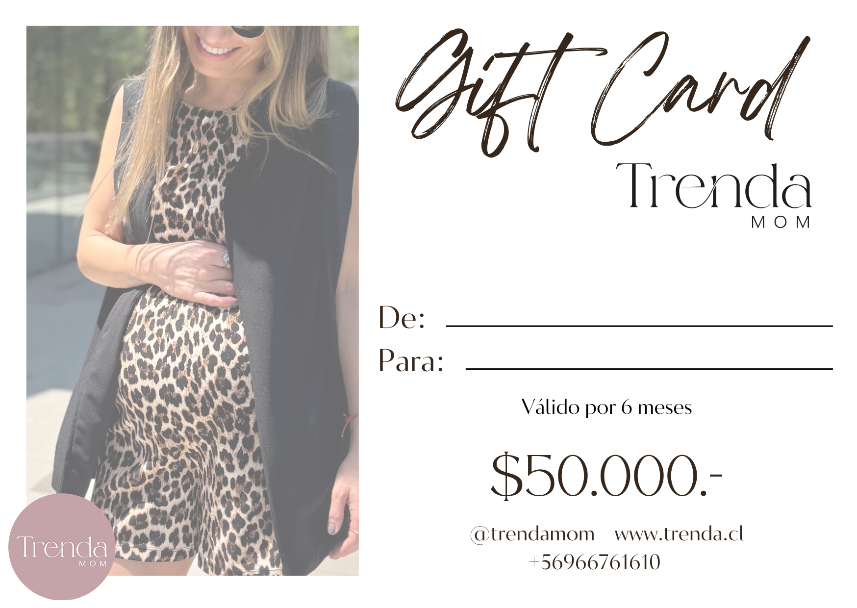 La Gift Card Trendamom es el regalo perfecto para futuras mamás, mamás recientes o cualquier mujer que ame la comodidad y el estilo. Permite comprar cualquier prenda de nuestra tienda online o en el punto de venta ubicado en Pueblito del Inglés, Local 41. Ideal para navidad, cumpleaños, baby showers o para sorprender con un detalle especial. ¿Cómo funciona? Selecciona el monto que quieras regalar. Envíanos un whatsaap para darnos el nombre de la persona a quien va dirigida y quien la envía. Recibirás la Gift Card digital por WhatsApp. Puedes reenviarla o imprimirla para entregar como regalo. La beneficiaria podrá usarla en cualquier compra.