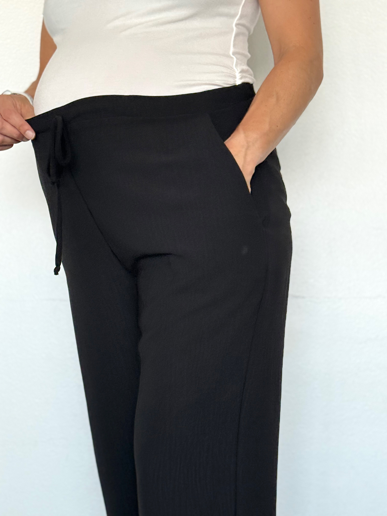 Pantalón FIYI negro, confeccionado en tela CEY, un material similar a la viscosa pero con textura, liviana y con una caída increíble que aporta movimiento y estilo a cada paso.